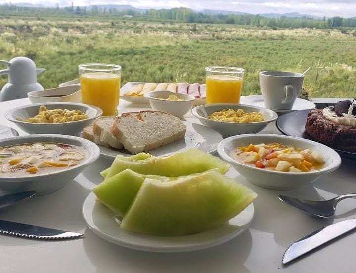 Iniciamos el dia disfrutando un desayuno completo, en nuestro salon de eventos, frente a la piscina con vista a la montaña como telon de fondo.